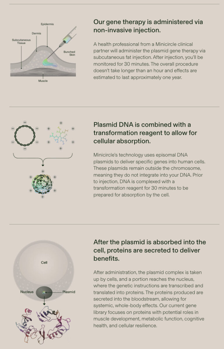 In collaboration with our partners at Minicircle, Proactive Longevity is able to provide Gene Therapy for the ultimate in personalized health, offering tailored techniques to precisely target and optimize specific genes involved in critical areas such as muscle growth (Follistatin), cognitive function (Klotho), and aging processes.
